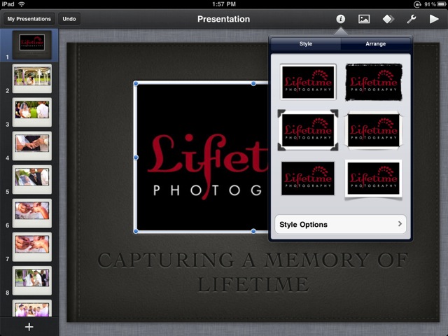 If you have previous experience with using the desktop version of Keynote, the iPad version won’t be too foreign to you. As with other iPhone and iPad applications, you basically build content by tapping buttons and making selections. The manual for the iPad Keynote describes all the how-tos and tools for the app. I’m going to share how to create a basic presentation for presenting photos, and what I like and dislike about the process.