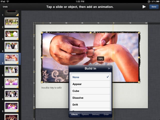 At this point you can also add builds, e.g. timing and transitions for each slide. Sometimes the Builds tool pops up when you tap the image, but if not you can select Builds button in the menu bar.