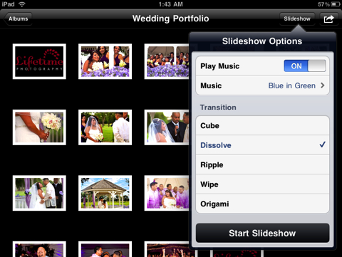 The other option is to launch the Photos app and select an album that you want to turn into a slide show. In the iPad version of slideshows, you can also add background music from your iPod collection on the device. Both options are very easy to set up and photos display beautifully.