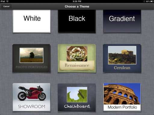 Another option for displaying images is to use Apple’s Keynote app, optimized for the iPad. Keynote enables you incorporate graphic themes, add titles and animations to your slide shows.