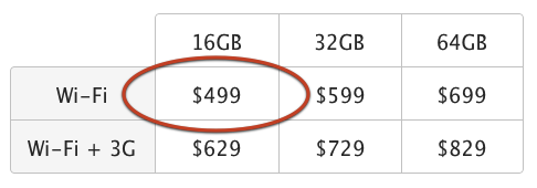 The iPad really is just a large, over-priced iPod touch. Apple is charging a $300 premium for the iPad over an iPod touch with the same memory. Granted, it’s a larger display, but that’s most certainly not costing Apple an extra $300 per device.