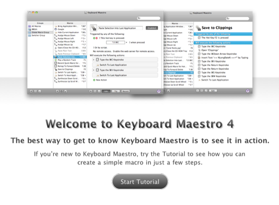 With the recent 4.1 update, Keyboard Maestro includes a slew of functionalities designed to help new users understand how to use the program. When the program is launched for the first time you’re invited to use a Start Tutorial that actually runs you through a step-by-step guide for creating your first macro. The tutorial is done by actually using the app, without having to watch a video or read a manual.