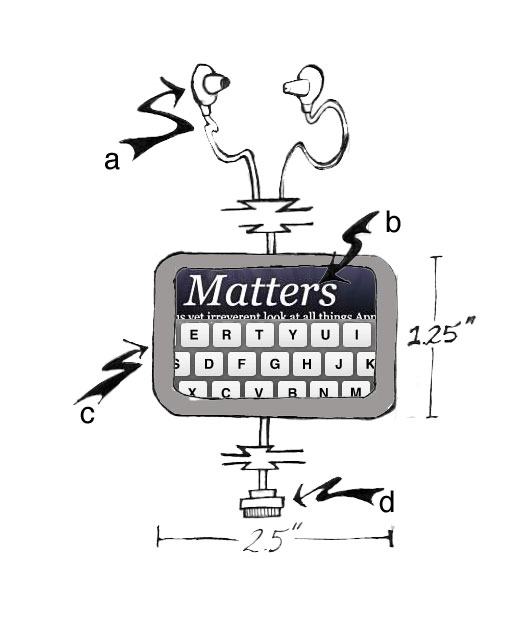 1. The MacBook shuffle. This is where the meat is. It looks like a dongle but it is so much more. That dongle is actually a fully powered Mac that gets the internet anywhere. But Apple knows that you don't want to haul around something you can't slide in a pocket so the iView is just an add on. Most people will use the MacBook shuffle with the awesome earphones that come with the thing. Take a look: